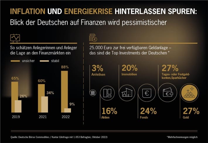 Angesichts einer Inflationsrate von rund 10 Prozent sind 65 Prozent der Deutschen durchaus besorgt um ihr privates Vermögen – 22 Prozent sogar sehr. Zu diesem Ergebnis kam das diesjährige Anlage-Barometer, eine repräsentative Studie des Marktforschungsinstituts Kantar Public im Auftrag von Deutsche Börse Commodities. Bei der letztjährigen Erhebung lag der Wert bei lediglich 45 Prozent (18 Prozent sorgten sich sehr). Die Einschätzung der Bundesbürger hat sich in den vergangenen zwölf Monaten somit deutlich verschlechtert.