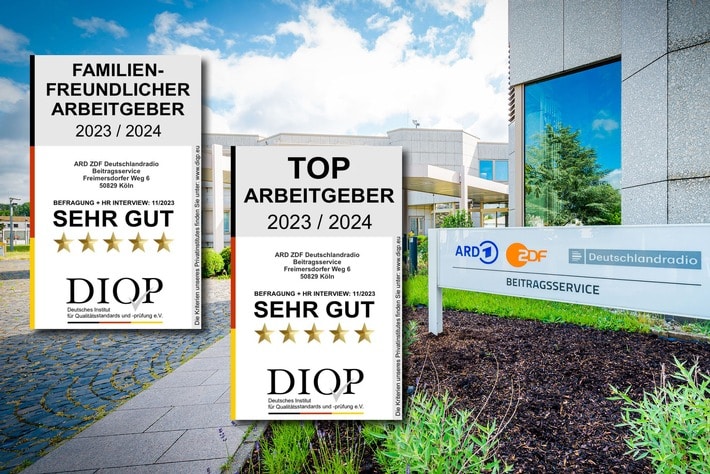 Das Deutsche Institut für Qualitätsstandards und -prüfung (DIQP) hat dem Beitragsservice von ARD, ZDF und Deutschlandradio nach gleich zwei Kriterien seine Attraktivität als Arbeitgeber bescheinigt. Sowohl in der Kategorie „Familienfreundlicher Arbeitgeber“ als auch in der Kategorie „Top-Arbeitgeber“ schnitt der Beitragsservice mit der Bestnote „Sehr gut“ ab.