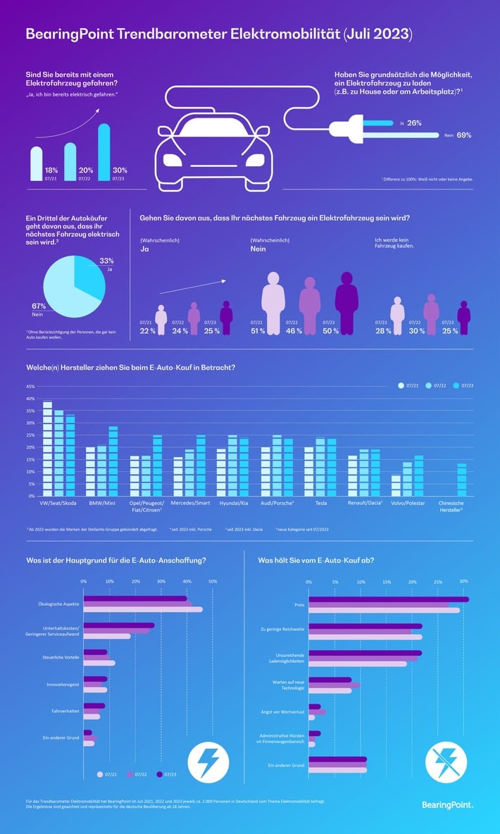 Seit 2021 veröffentlicht BearingPoint das Trendbarometer Elektromobilität im halbjährlichen Rhythmus. Die für das Trendbarometer verwendeten Daten beruhen auf einer von BearingPoint in Auftrag gegebenen Online-Umfrage der YouGov Deutschland GmbH, an der 2026 Personen zwischen dem 5. und 7. Juli 2023 teilnahmen. Die Ergebnisse wurden gewichtet und sind repräsentativ für die deutsche Bevölkerung ab 18 Jahren.