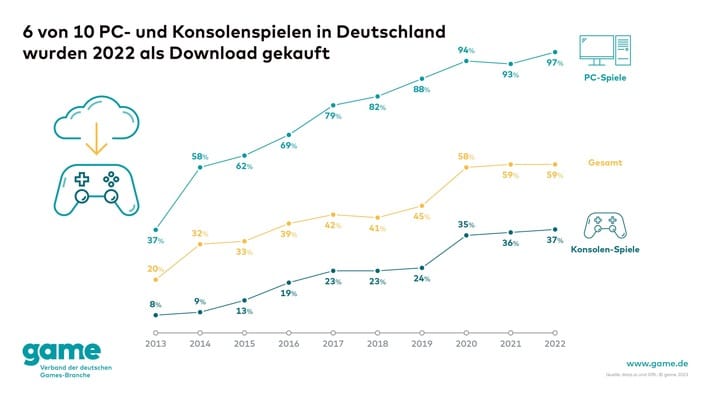 – Anteil der Download-Käufe von PC- und Konsolenspielen in Deutschland lag 2022 bei 59 Prozent