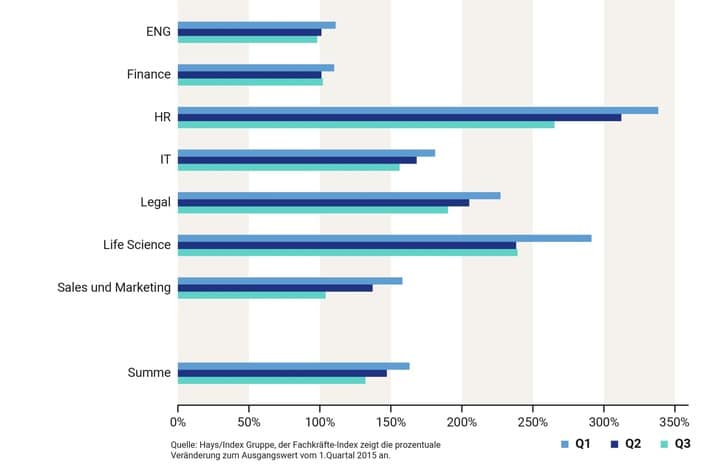 Der Hays-Fachkräfte-Index (https://www.hays.de/personaldienstleistung-aktuell/fachkraefte-index) basiert auf einer quartalsweisen Auswertung der index Internet und Mediaforschung GmbH für Hays. Einbezogen werden Stellenanzeigen der meistfrequentierten Online-Jobbörsen, von Tageszeitungen sowie dem Business-Netzwerk Xing. Der Fachkräfte-Index zeigt die prozentuale Veränderung zum Ausgangswert vom 1. Quartal 2015 an. Sämtliche Positionsbezeichnungen gelten grundsätzlich für alle Geschlechter.