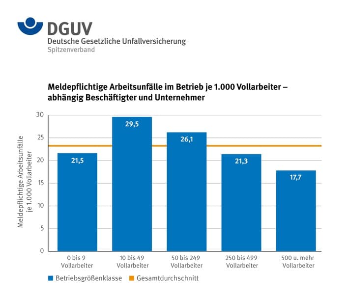 In Großbetrieben mit mehr als 500 Beschäftigten ist das Risiko, einen Arbeitsunfall zu erleiden, geringer als in Kleinen und Mittelständischen Unternehmen (KMU). Das geht aus einer Auswertung zum „Arbeitsunfallgeschehen 2021“ der Deutschen Gesetzlichen Unfallversicherung (DGUV) hervor, die nun in Broschürenform vorliegt. In Großbetrieben lag die Quote der meldepflichtigen Arbeitsunfälle im Jahr 2021 bei 17,7 Unfällen je 1000 Vollarbeiter.* Dies ist im Vergleich der Betriebsgrößen der niedrigste Wert, die höchste Arbeitsunfallquote hingegen wird mit 29,5 für die Betriebe mit 10 bis 49 Beschäftigten verzeichnet. In Kleinstbetrieben mit bis zu 9 Beschäftigten lag 2021 die Unfallquote mit 21,5 etwas niedriger, allerdings haben sie die höchste Quote an neuen Unfallrenten. Diese sind ein Indiz für schwere Unfallverläufe.