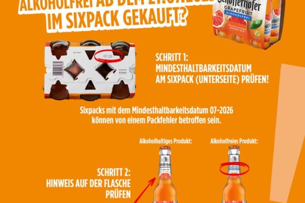 Die Schöfferhofer Weizenbier GmbH informiert über einen Verpackungsfehler / Einzelne Sixpacks von Schöfferhofer Weizen-Mix Grapefruit Alkoholfrei könnten alkoholhaltige Produktvariante enthalten