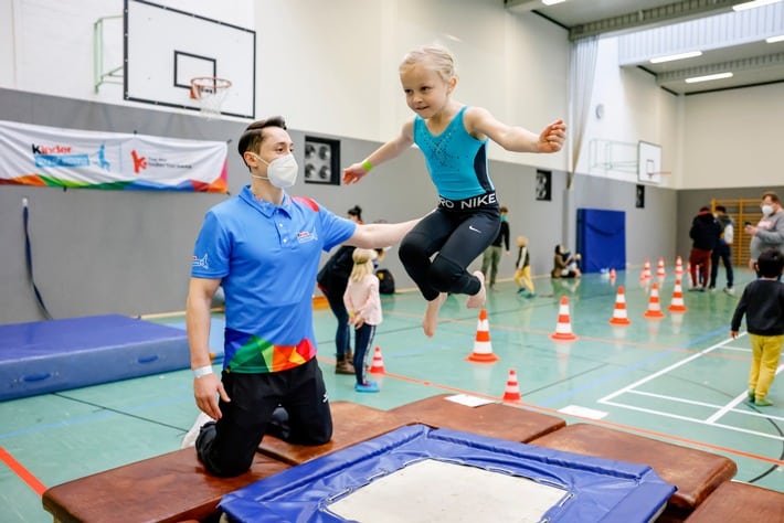 Neben dem Turn-Team Deutschland und dem „Das kann ich schon!“-Abzeichen können sich alle Kids im „kinder Joy of Moving-Turnparcours“ an abwechslungsreichen Turnelementen ausprobieren.