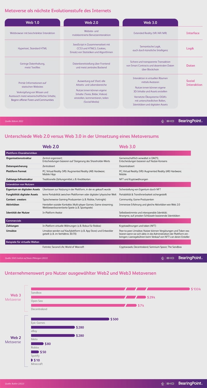 Das Internet, so wie wir es bisher kennen, entspricht einer unzusammenhängenden Sammlung von Webseiten und Anwendungen – geschaffen um statische Daten wie z. B. Dokumente auszutauschen. Es ist weniger gut geeignet, um in Echtzeit an interaktiven Erlebnissen teilzuhaben, gerade bei einer Vielzahl von Anwender:innen. Genau das aber verspricht die nächste Evolutionsstufe des Internets. So will das Web3 die Art und Weise, wie wir das Internet nutzen, demokratisieren, indem es die großen Plattformen wie Google, Amazon oder Facebook ersetzt und deren Einfluss auf das Internet reduziert. Eine dezentrale Datenhaltung soll dabei verhindern, dass ein paar Unternehmen das Internet und die Metaverse kontrollieren.