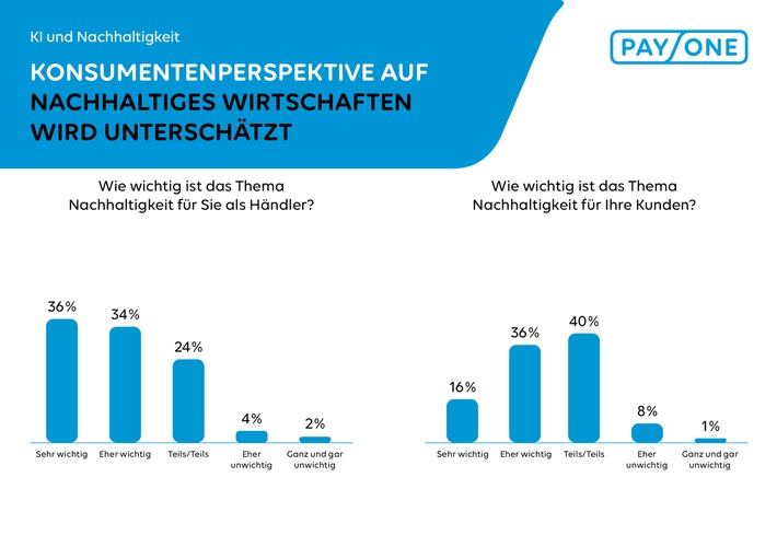 PAYONE, Joint Venture von Worldline, ein weltweit führender Anbieter von Zahlungsverkehrsdienstleistungen, sowie der DSV-Gruppe, Kompetenzcenter Payment der Sparkassen-Finanzgruppe, hat in Deutschland und Österreich eine repräsentative Umfrage bei mehrheitlich stationären Händlern zu Stellenwert und Erwartungen an KI und Nachhaltigkeit in Bezug auf effizientere Prozesse und intensivere Kundenbindung durchgeführt. Dabei wurden bundesweit 333 Händlerkunden in Deutschland sowie 150 in Österreich – mehrheitlich aus dem kleinen und mittelgroßen Händler-Segment* – quer über alle Branchen hinweg befragt. Nachfolgend werden die Ergebnisse rund um das Thema Nachhaltigkeit vorgestellt.