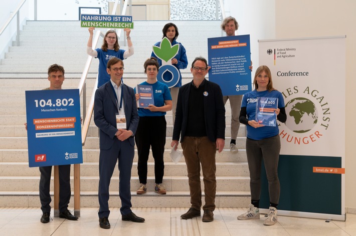 Aktion gegen den Hunger hat heute die Petition „Gesicht zeigen gegen Hunger: Menschenrechte statt Konzerninteressen“ an Vertreter der Bundesregierung im Rahmen der internationalen „Politik gegen Hunger“-Konferenz übergeben. 104.802 Menschen haben die Forderungen mit ihrer Unterschrift unterstützt. Die zentrale Forderung: Die Bundesregierung muss ihrer menschenrechtlichen Verpflichtung nachkommen und das Recht auf Nahrung endlich wirksam schützen und umsetzen.