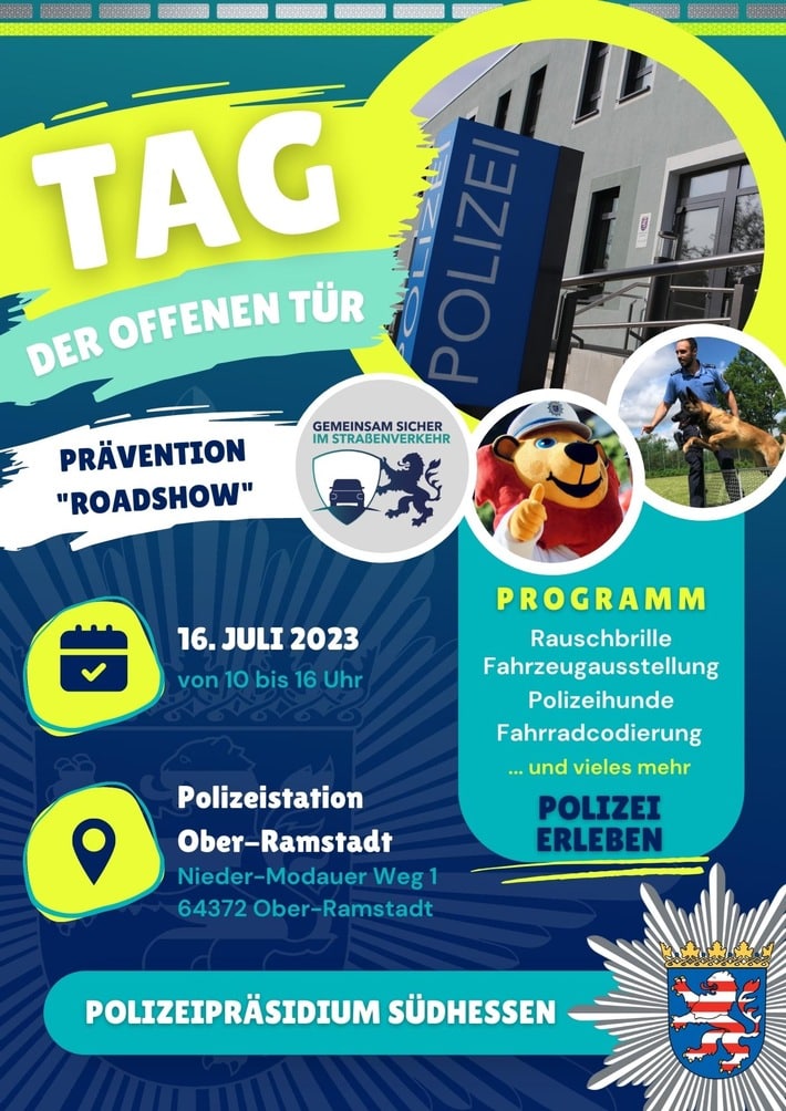 Die Polizei in Ober-Ramstadt öffnet am Sonntag, dem 16. Juli, von 10 bis 16 Uhr ihre Türen. Alle Bürgerinnen und Bürger sind herzlich dazu eingeladen, ihre örtliche Polizei besser und näher kennenzulernen, die modernen Polizeidiensträume im Nieder-Modauer Weg 1 zu besichtigen und gleichzeitig an dem abwechslungsreichen Programm der hessenweiten Roadshow im Rahmen der Präventionsoffensive „Gemeinsam sicher in Hessen“ teilzunehmen. In Südhessen steht hierbei das Thema „Gemeinsam sicher im Straßenverkehr“ im besonderen Fokus des Programms, zu dem unter anderem zahlreiche Aktionen zur Verkehrsprävention für alle Altersgruppen geplant sind.