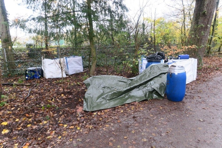 Bei der Ablagerung handelt es sich um 5 weiße „big bags“ mit mindestens je ca. 20 blauen Kanistern (Fassungsvermögen: je 20 Liter), drei schwarze Müllsäcke mit mindestens je 10 Kanistern der gleichen Art, 5 teilweise umgekippte und offensichtlich bereits ausgelaufene blaue Fässer mit mindestens je 100 l Fassungsvermögen sowie eine große grüne Regentonne, deren Inhalt offensichtlich ebenfalls ins Erdreich gelangen konnte.