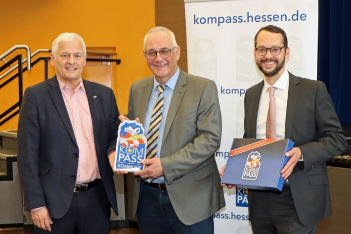 Lohfelden (Landkreis Kassel): KOMPASS, die Sicherheitsinitiative der hessischen Landesregierung, hat eine neue teilnehmende Kommune: Lohfelden im Landkreis Kassel. Am Donnerstagnachmittag begrüßte Nordhessens Polizeipräsident Konrad Stelzenbach die Gemeinde im Lohfeldener Bürgerhaus als 15. nordhessische Kommune in dem Programm. Der Polizeipräsident und der Leiter der Stabsstelle „Gemeinsam Sicher in Hessen“ des Hessischen Innenministeriums, Jan Schneider, überreichten während der Veranstaltung gemeinsam das KOMPASS-Begrüßungsschild an Lohfeldens Bürgermeister Uwe Jäger (siehe Foto). Dies symbolisiert nun sichtbar nach außen, dass sich Lohfelden mit der Teilnahme an KOMPASS (KOMmunalProgrAmmSicherheitsSiegel) besonders für die Sicherheit seiner rund 14.000 Bürgerinnen und Bürger einsetzt.