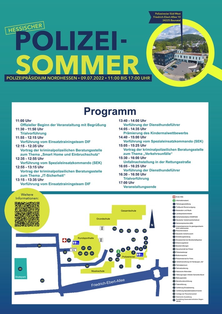 Nordhessen: Nicht mehr lange bis zum „Tag der Polizei“ am 9. Juli in Baunatal im Rahmen der hessenweiten Veranstaltungsreihe „Hessischer Polizeisommer“ – Das Polizeipräsidium Nordhessen bietet den Bürgerinnen und Bürgern an diesem Tag ein spannendes Programm mit vielen Vorführungen, Attraktionen sowie Informationen und lädt alle Interessierten recht herzlich ein. Auch für die Kleinsten gibt es an diesem Tag viel Spannendes rund um die Polizei zu erleben.
