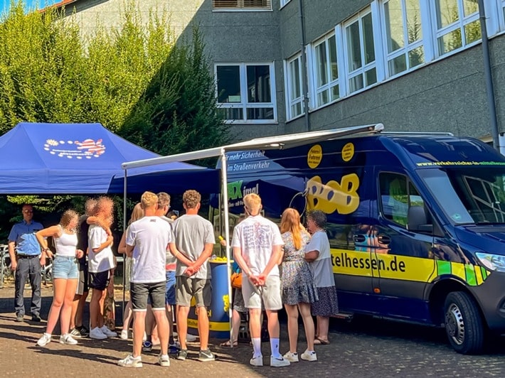 Ob am Info-Stand mit einer Multimedia-Säule des Deutscher Verkehrssicherheitsrates (DVR) oder am Fahrsimulator vom B.A.D.S (Bund gegen Alkohol und Drogen im Straßenverkehr), am Gurtschlitten und am Überschlag-Simulator der Deutsche Verkehrswacht oder am Unfallfahrzeug, der Reaktionswand (T-Wall) oder auf dem Rauschbrillen-Kettcar-Parcours der Polizei Mittelhessen: Überall konnten sich die jungen Verkehrsteilnehmenden sehr anschaulich und mit selbst gemachten Erfahrungen zu Risiken, Gefahren und den Unfallursachen im Straßenverkehr, auseinandersetzen und umfangreich bei den Verkehrsexperten informieren. Die Wirkung von Alkohol oder Drogen auf die Fahrtüchtigkeit, insbesondere das Sehvermögen oder die Reaktionsfähigkeit, konnten die Schülerinnen und Schüler hautnah und absolut ungefährlich mit Rauschbrillen simulieren oder am Steuer des Fahrsimulators mit völlig nachhaltigen Eindrücken erleben. Vor allem gab es viele Hinweise und Tipps, wie man durch richtiges Verhalten gefährliche Situationen oder Unfälle im Straßenverkehr vermeiden kann. Vom Deutschen Roten Kreuz – Rettungsdienst Mittelhessen war sogar ein Einsatzfahrzeug auf dem Schulhof und dessen Besatzung wusste einiges über die wichtige und oft nicht einfache Arbeit der Rettungsdienste bei Verkehrsunfällen zu berichten. Gleichzeitig stellten die Sanitäter dabei ihr Berufsbild vor. Trotz großer Hitze gab es an den Info-Ständen an der Marburger Schule viele gute Gespräche und zahlreiche der bekannten knallgelben „BOB-Anhänger“ fanden einen neuen Eigentümer.