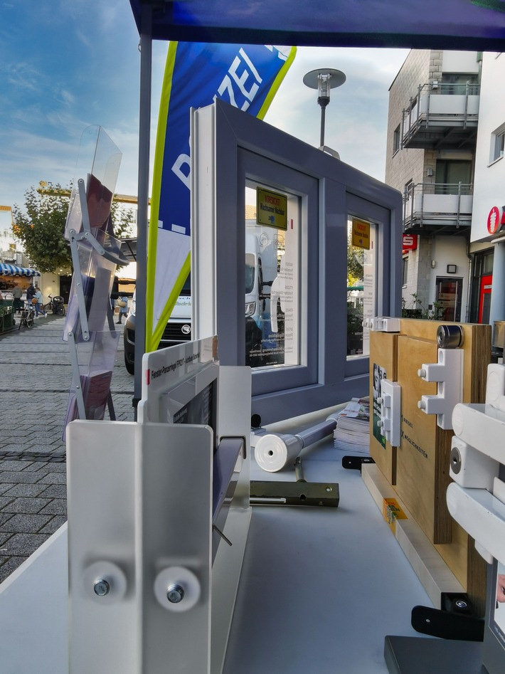 Immer dabei hat der Polizeiberater sein Einbruchsfenster und einige Utensilien. So kann er zum Beispiel direkt demonstrieren, warum eine Pilzkopfverriegelung im Fensterrahmen einen besseren Schutz gegen Aufhebeln bietet. Neben den wertvollen Tipps, praktischen Informationen und Broschüren zur Sicherung von Haus und Wohnung am Stand bietet die Polizei ganzjährig auch individuelle Beratung an: Der Polizeiliche Berater, Polizeihauptkommissar Jürgen Seewald, besucht Interessierte auf Wunsch zuhause und untersucht die Immobilie auf potenzielle Schwachstellen, die Einbrechende nutzen könnten. Dabei erhalten die Interessierten kostenlos und unverbindlich konkrete Empfehlungen, wie sie ihr Eigentum wirksam vor Einbrüchen schützen können. Ziel der gemeinsamen Initiative ist es, nicht nur ein Informations-, sondern auch ein Gesprächsangebot seitens der Polizei zu machen. „Mit unseren Beratungsangeboten wollen wir den Bürgerinnen und Bürgern zeigen, dass jeder etwas für den Schutz seines Zuhauses tun kann und dass es manchmal schon ganz kleine Dinge sein können, die schützen“, so Seewald.