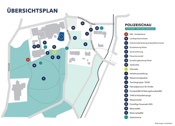 Auch ein Wasserwerfer der Bereitschaftspolizei wird in Aktion sein sowie Polizeitaucher und die DLRG, die im Außenbecken der Spessart Therme ihr Können zeigen. Auf der Infomeile werden verschiedene Organisationen für Bürgerinnen und Bürger ansprechbar sein. Auch die Abteilung Prävention des Polizeipräsidiums Südosthessen wird über Themen wie Einbruchsschutz und Cyberkriminalität informieren. Auf dem angehängten Übersichtsplan sind die Standorte aller teilnehmenden Institutionen zu sehen.