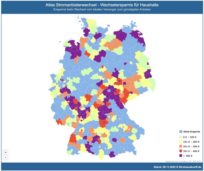 Quelle: Wechselersparnis am 28.11.2022, https://www.stromauskunft.de/stromanbieter-wechsel/wechselersparnis/
