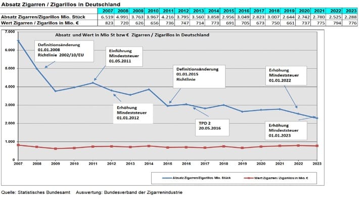 „Grundsätzlich zeigt der traditionelle Markt klassischer Zigarren- und Zigarilloprodukte seit vielen Jahren einen stabilen bis leicht rückläufigen Trend. Die Versteuerungsstatistik des Statistischen Bundesamtes, die den Bezug von Steuerzeichen durch die Unternehmen abbildet, entspricht nie genau den Entwicklungen des Marktes bzw. des tatsächlichen Abverkaufs. Durch die starken Erhöhungen der Mindeststeuer zum Januar 2022 und Januar 2023 geht der Bundesverband der Zigarrenindustrie von einem weiteren Rückgang im niedrigpreisigen Segment aus, während sich das Segment der klassischen Zigarren und Zigarillos relativ stabil bis leicht rückläufig zeigt“.
