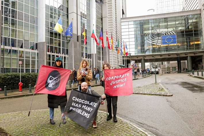 Schokolade gerechter machen: gebana zeigt in Brüssel Flagge für ein starkes EU-Sorgfaltspflichtengesetz