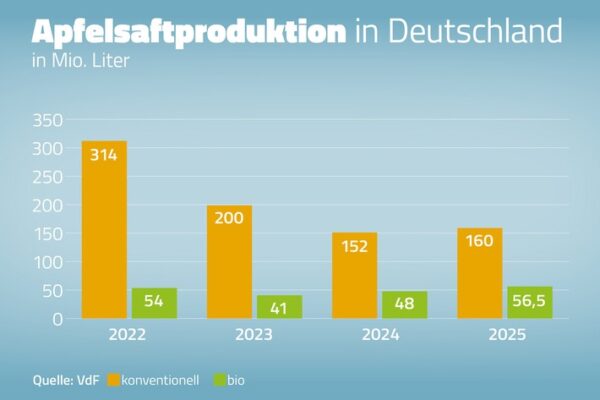 Keltersaison 2025 / Niedrige Apfelsaftmenge mit hohem Bio-Anteil zu hohen Preisen gekeltert
