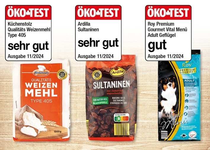 Top Bewertungen in der Novemberausgabe des Magazins Ökotest – sehr gut und gut – von Mehl und Rosinen bis Hundefutter / 3-fach Auszeichnung beim Lebensmittel-Discounter NORMA im November 2024