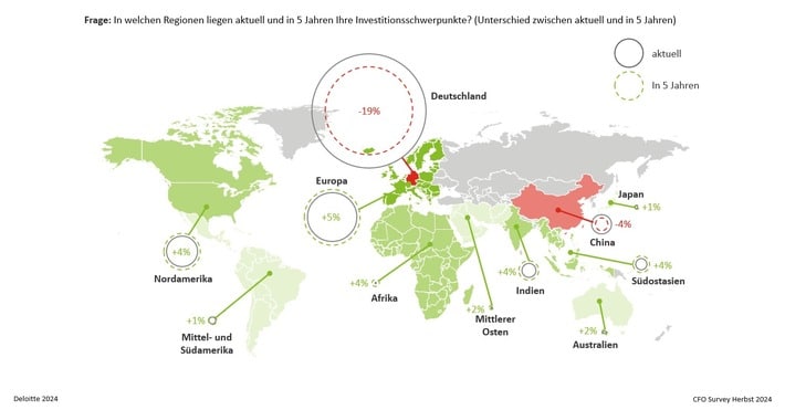 Deutsche Unternehmen planen, in Zukunft mehr Geld im Ausland und weniger in Deutschland zu investieren. Das zeigen die Ergebnisse des CFO Survey von Deloitte. Während aktuell noch eine deutliche Mehrheit der Befragten (82%) ihren Investitionsschwerpunkt in Deutschland sieht, gilt das in fünf Jahren nur noch für 63 Prozent. An der Umfrage haben zwischen dem 12. September und dem 2. Oktober 185 Finanzvorstände deutscher Großunternehmen teilgenommen.