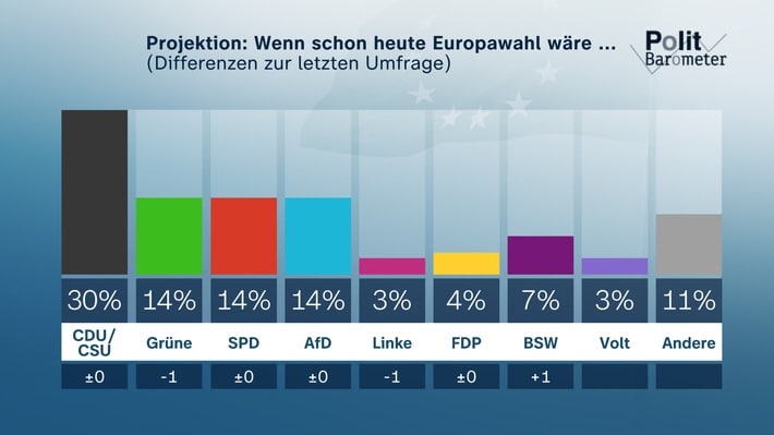 Wenn schon heute Europawahl wäre, dann ergäben sich derzeit folgende Projektionswerte für die Parteien: Die Union käme auf 30 Prozent (unverändert gegenüber der Umfrage vor einer Woche), die Grünen auf 14 Prozent (minus 1), die SPD auf 14 Prozent, die AfD auf 14 Prozent (beide unverändert), die Linke auf 3 Prozent (minus 1), die FDP auf 4 Prozent (unverändert), das BSW auf 7 Prozent (plus 1) und Volt auf 3 Prozent. Die anderen Parteien zusammen lägen bei 11 Prozent, darunter keine Partei, die mindestens drei Prozent erzielen würde.